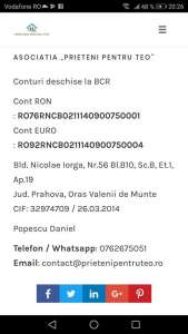 SocialContribuie și tu la Campania caritabilă „Suflete pentru Teodor” pentru a da o șansă vieții unui copil de numai 5 anișori By RedactiaPosted on 31/08/20188 min read0 0 780 Share on Facebook Share on Twitter Share on Google+ Share on Reddit Share on Pinterest Share on Linkedin Share on Tumblr Miercuri, în Centrul Civic al municipiului Ploiești, site-ul de știri Info Ploiești City, DJ Kabal în colaborare cu ACS D. Victoria Team (secția de kickboxing Ciprian Ardeleanu TEAM) și stirileproprahova.ro au organizat un amplu eveniment caritabil pentru un baiețel, în vârstă de numai 5 ani, din orașul Vălenii de Munte, diagnosticat printre altele cu paralizie cerebrală, tetrapareză spastică.Această acțiune caritabilă a conținut momente de dans, muzica live, demonstraţii de kickboxing susţinute de Ciprian Ardeleanu TEAM şi Florin Ghiţă Academy.Totodată, au participat artiștii de la Clubul Artist (profesor-coordonator Roxana Furtună) Larisa Necula, Elena Ene, Antonia şi Ciprian Duda,Ioana Polydora,Leonard Dedu, Crina şi Alin David, Petty Musa, Marllen Mery, Miletta Popa, Excelent (Antonio Gabriel), LayLow şi Kdy, Eduard Stoica, Lavinia Bănica şi grupul Trandafirul Jr., Fabiana Vuță, Fratele Tase și, nu în ultimul rând, trupa de dans și fetno Sophy Dance (profesor-coordonator Georgiana Dumitru). De asemenea, un moment special a fost o demonstrație de tarabane a toboşarilor de la Organizaţia Umanitară Concordia Ploiești.Pe lângă aceste momente artistice, au fost organizate o expoziţie de picturi pe șevalet a deţinuţilor de la Penitenciarul Ploieşti, dar si o expoziţie, cu vânzare, de hand made marca „Enya Worshop”, Enya donând toată suma încasată pe vânzâri, aproximativ 300 de lei, pentru viitorul micuțului Teo.Invitatul special al acestui eveniment a fost Mirela Dulgheru, conferenţiar universitar doctor la Universitatea „Petrol – Gaze” Ploieşti, Cetăţean de onoare al municipiului Ploiești, fostă campioană mondială universitară de atletism, la proba de săritură în lungime (Buffalo – SUA, 1993), două recorduri naţionale în sală, la săritura în lungime (6.99 m – 1993) şi la 60 m (7.22 sec. – 1993).Un alt moment atractiv al evenimentului a fost un punct de informare si educare a populatiei în „acordarea primului ajutor de bază” și o ambulanță SMURD (tip 2 ) de la ISU Prahova, pompierii fiind „asaltați” de copiii doritori să afle cum se acordă primul ajutor.Un gest cu totul deosebit a făcut-o unul dintre jandarmi, Florin Tudoran, care nu numai că a fost primul care a contribuit la urna pentru o șansă la o viață normală pentru Teo. Mai mult, ad-hoc, a compus un poem dedicat acestei acțiuni caritabile, reușind să atingă emoțional toată asistența.După terminarea spectacolului, organizatorii, împreună cu tatăl lui Teodor, Popescu Daniel Nicolae, au numărat suma strânsă la acest eveniment în prezența reprezentanților Jandarmeriei Prahova și a unui martor, suma totală a donației fiind de 5.073 lei și 260 euro, per total, aproximativ 1.350 euro. O sumă record pentru astfel de acțiuni, dar insuficientă pentru tratamentul de care are nevoie acest copilaș, Teo, ca să aibă o șansă la o viață normală.Scopul acțiunii este de a strange fonduri pentru micuțul Teo, 5 anișori, din orașul prahovean Vălenii de Munte, diagnosticat cu o multitudine de afecțiuni. Pentru recuperare, Teo a început diverse tratamente și, totdată, a suferit unele intervenții chirurgicale. Însă familia nu deține o situație materială care să-i permită un tratament continuu de care are nevoie implicit pentru operațiile aferente, astfel că, prin intermediul acestui proiect, dorim să redăm șansa la o viață cât mai normal acestui copil.Orice sumă, cât de mică, este un gest măreț. Să fim alături de Teo, să ajungem la 40.000 de euro, suma necesară pentru un tratament în străinătate, donând în conturile:CONT RON: RO76RNCB0211140900750001CONT EURO: RO92RNCB0211140900750004Partenerii evenimentului: Had Security, Biroul individual de arhitectură Andra Georgescu, Enya Hand Made, Penitenciarul Ploieşti şi Fitness Club Nico.Parteneri foto: PhotoStudio Ploieşti, Marian Cojocaru Photography, Pufy Art şi Tazzy Photography.Parteneri mass-media: www.stirileproprahova.ro şi Valea Prahovei TV.Sponsori: Curatenie-Prahova.ro, Lucky Weeding și Peluza Latină (suporteri Petrolul Ploiești).Eveniment prezentat de: Petty Musa (actriţă Teatru „Toma Caragiu” Ploieşti) şi Virgil Rădulescu (director stirileproprahova.ro).Evenimentul a fost organizat cu sprijinul: Primăriei Municipiului Ploieşti, SGU Ploieşti, Poliţia Locală Ploieşti, Jandarmeria Prahova, ISU Prahova, RASP Ploieşti, Filarmonica „Paul Constantinescu” Ploiești, Teatrul „Toma Caragiu” Ploiești și DJ Marian Anghel, cărora le mulțumim pe această cale.Poze eveniment AICI: https://www.facebook.com/gabidimafanpage/media_set?set=a.738611183138584&type=3&fb_dtsg_ag=AdySOByGoa_cMSNhsDe8f3hatHRuByvEhiNqq62CdkkqMQ%3AAdyl4PHdMTH8wQ83Tgi7o4P5ejfak8xmfeJscg1zfCkwUg