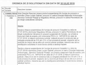 JustițieCSM decide suspendarea din funcţie a procurorilor Onea şi Negulescu By RedactiaPosted on 31/07/201812 min read0 0 667 Share on Facebook Share on Twitter Share on Google+ Share on Reddit Share on Pinterest Share on Linkedin Share on Tumblr Secţia pentru procurori a Consiliului Superior al Magistraturii a decis, luni, suspendarea din funcţie a fostului şef al DNA Ploieşti Lucian Onea şi a procurorului Mircea Negulescu. Vineri, procuror Mircea Negulescu şi fostul şef al DNA Ploieşti Lucian Onea au fost chemaţi la Parchetul General, unde au fost anunţaţi că au fost plasaţi sub control judiciar pe o perioadă de 60 de zile. Potrivit unui comunicat al Parchetului General, celor doi li s-au impus, printre altele, următoarele obligaţii: să nu comunice între ei şi, respectiv, cu anumite persoane menţionate în ordonanţe, să nu exercite profesia de procuror, să nu deţină, să nu folosească şi să nu poarte arme. Lucian Onea este acuzat de participaţie improprie, sub forma complicităţii, la săvârşirea infracţiunii de inducere în eroare a organelor judiciare, represiune nedreaptă şi cercetare abuzivă, iar Mircea Negulescu este cercetat pentru participaţie improprie, sub forma complicităţii, la săvârşirea infracţiunii de inducere în eroare a organelor judiciare şi complicitate la infracţiunea de represiune nedreaptă. Parchetul General susţine că, în anul 2015, Lucian Onea şi Mircea Negulescu au determinat prin constrângere un martor, Vlad Cosma, ameninţându-l în mod direct că o vor inculpa pe sora acestuia, Andreea Cosma, să întocmească în fals o sesizare pe un alt nume şi tabele/liste cu alegători din Republica Moldova, documente din care să rezulte că alegătorii ar fi primit bani drept „mită electorală”. Documentele au fost expediate prin fax şi poştă din Chişinău la Direcţia Naţională Anticorupţie – Serviciul Teritorial Ploieşti. Parchetul mai arată că, deşi ştia că probele sunt ticluite în mod mincinos de martor, Lucian Onea a solicitat Tribunalului Prahova arestarea preventivă a unui inculpat pentru infracţiunea de coruperea alegătorilor, prezentând instanţei, drept probe, documentele ticluite.„În anul 2015, inculpaţii procurori Onea Lucian (procuror şef în cadrul Direcţiei Naţionale Anticorupţie – Serviciul Teritorial Ploieşti) şi Negulescu Mircea (la data faptelor procuror în cadrul Parchetului de pe lângă Curte de Apel Ploieşti) au determinat prin constrângere un martor (ameninţându-l în mod direct că o vor inculpa pe sora acestuia într-o cauză penală) să întocmească în fals o sesizare pe un alt nume şi tabele/liste cu alegători din Republica Moldova, documente din care să rezulte că alegătorii ar fi primit bani drept „mită electorală”. Documentele au fost expediate prin fax şi poştă din Chişinău la Direcţia Naţională Anticorupţie – Serviciul Teritorial Ploieşti”, spune Parchetul instanţei supreme.Parchetul Înaltet Curţi de Casaţie şi Justiţie a transmis miercuri că procurori ai Secţiei de urmărire penală şi criminalistică din cadrul au dispus punerea în mişcare a acţiunii penale faţă de fostul procuror Onea Lucian, sub aspectul săvârşirii infracţiunilor de participaţie improprie, sub forma complicităţii, la săvârşirea infracţiunii de inducere în eroare a organelor judiciare, represiune nedreaptă şi cercetare abuzivă.Joi, DNA a anunţat că procurorul-şef interimar Anca Jurma a dispus efectuarea unui control la Serviciul Teritorial Ploieşti, după ce Parchectul General a anunţat că-l cercetează pe Lucian Onea. Sunt vizate toate dosarele în care sunt implicaţi membrii familiei Cosma, dar şi măsurile dispuse în aceastea de fostul procuror-şef Onea, după data de 18 mai 2018.Inspecţia Judiciară a anunţat, luni seară, că va face un control tematic comun privind respectarea principiilor generale care guvernează activitatea Autorităţii Judecătoreşti în cauzele de competenţa DNA ce vizează magistraţi sau care au legătură cu aceştia, după ce adjunctul DNA, Marius Iacob, a dezvăluit că la parchetul anticorupție sunt în lucru 300 de cauze privind magistrați. Ancheta Inspecției vizează dosarele DNA în care sunt vizați judecători și procurori. Controlul privește inclusiv judecătorii care au soluționat cauzele DNA, deși aveau dosar la Direcția Națională Anticorupție.Controlul va avea loc în perioada 1 august – 1 octombrie.„Inspectia Judiciară, prin inspectorii de la Direcţiile de inspecţie judiciară pentru procurori şi, respectiv, judecători, va efectua în perioada 1 august – 1 octombrie 2018 un control tematic comun privind respectarea principiilor generale care guvernează activitatea Autorităţii Judecătoreşti în cauzele de competenţa Direcţiei Naţionale Anticorupţie vizând magistraţi sau în legătură cu acestea”, a anunţat Inspecţia Judiciară.Verificările vizează perioada 1 iaunuarie 2014 – 30 iulie 2018, iar raportul va fi înaintat Consiliului Superior al Magistraturii până la 5 noiembrie, conform Inspecţiei Judiciare.Controlul are loc în contextul în care procurorul şef adjunct al DNA Marius Iacob a precizat în proiectul de management depus la Ministerul Justiţiei că la DNA sunt înregistrate aproximativ 300 de dosare în care sunt cercetaţi magistraţi, dosare care ar trebui înainte noii secţii care ar urma să fie înfiinţată în Parchetul General, conform modificărilor aduse Legii 304/2004 privind organizarea judiciară.„Înfiinţarea Secţiei pentru investigarea infracţiunilor din Justiţie în cadrul Parchetului de pe lângă Înalta Curte de Casaţie şi Justiţie duce la modificarea competenţei DNA cu privire la persoanele care deţin calitatea de judecător sau procuror. Legea nr. 207/2018 prevede şi obligaţia Direcţiei Naţionale Anticorupţie de a înainta cauzele în care sunt cercetaţi magistra