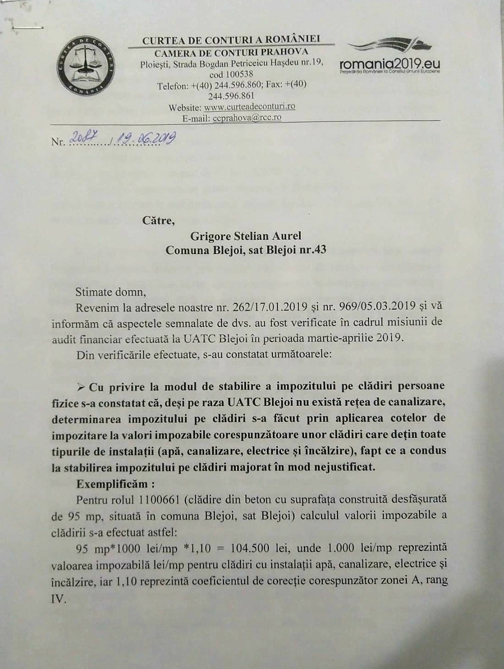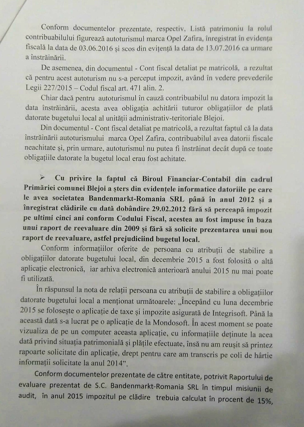 Economic FrontCurtea de Conturi: Primăria Blejoi impozitează abuziv contribuabilii By RedactiePosted on 28/08/20204 min read0 0 2,023 Share on Facebook Share on Twitter Share on Google+ Share on Reddit Share on Pinterest Share on Linkedin Share on Tumblr Curtea de Conturi a descoperit că Primăria Blejoi, condusă de edilul Adrian Dumitru de la PSD, impozitează ilegal contribuabilii cu sume mult mai mari decât ar trebui. Diferența provine dintr-o eroare de interpretare a legii din partea Primăriei Blejoi. Ce face Primăria Blejoi. Colectează impozite pentru ”clădiri cu instalații”, ca și cum gospodăriile din localitate ar fi racordate la rețeaua de canalizare funcțională. Or, sistemul public de canalizare din comuna Blejoi nu este încă funcțional. În plus, Primăria Blejoi consideră locuințele cu fosă septică ca fiind ”clădiri cu instalații”, ceea ce este greșit, a explicat, cu legea în mână, Stelian Grigore, expert în cadrul Primăriei și candidat la funcția de primar al comunei Blejoi din partea Partidului Prahova în Acțiune. Ce spune legea. Potrivit Codului fiscal, ”clădirea se consideră că are instalație de canalizare dacă este dotată cu conducte prin care apele menajere sunt evacuate în rețeaua publică”. Ce ar trebui să facă Primăria Blejoi. ”Locuința racordată la propria fosă septică nu reprezintă clădire cu instalație de canalizare în înțelesul prevederilor legale menționate, caz în care impozitul care ar trebui aplicat este cel pentru clădire fără instalații”. Ce a stabilit Curtea de Conturi. Diferența este semnificativă între cele două tipuri de impozite pentru ”clădiri cu instalații” și pentru ”clădiri fără instalații”, ceea ce înseamnă că Primăria Blejoi colectează abuziv, de ani de zile, sume mult mai mari decât prevede legea. Foto 1: fragment din documentul Curții de Conturi privind modalitatea abuzivă de impozitare practicată de primăria Blejoi, condusă de Adrian Dumitru de la PSD Foto 2: fragment din documentul Curții de Conturi privind modalitatea abuzivă de impozitare practicată de primăria Blejoi, condusă de Adrian Dumitru de la PSD Cine răspunde. Cine dă înapoi blejoienilor banii colectați ilegal. ”În baza raportului Curții de Conturi, locuitorii din Blejoi ar trebui să dea în judecată primarul și Consiliul Local și să ceară restituirea sumelor colectate nelegal”, a declarat avocatul Răzvan Stănciulescu, lider al Partidului Prahova în Acțiune și candidat pentru funcția de primar al municipiului Ploiești.