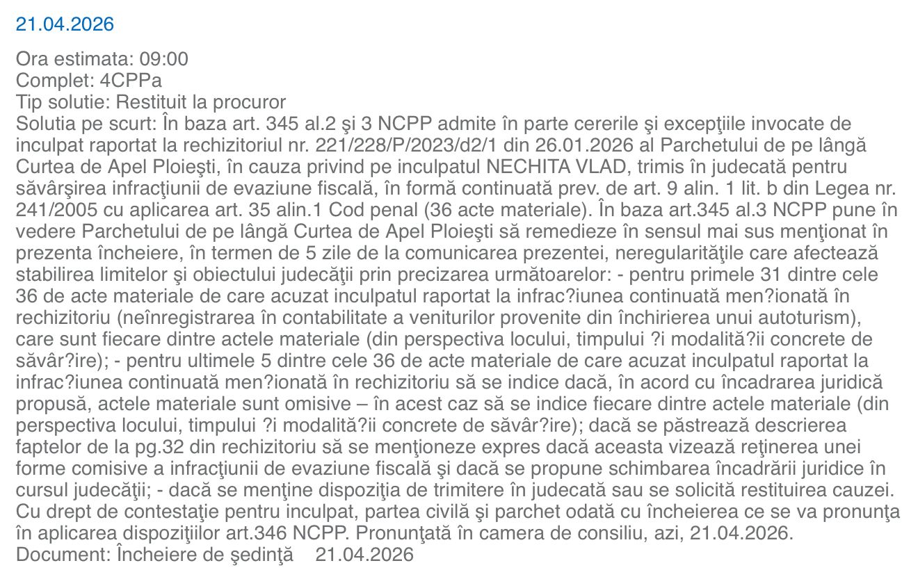 Front JustițieDecizie în dosarul „White Tower”: instanța retrimite cauza la Parchet pentru corectarea rechizitoriului By RedactiePosted on 21/04/20263 min read0 0 98 Share on Facebook Share on Twitter Share on Google+ Share on Reddit Share on Pinterest Share on Linkedin Share on Tumblr Un nou moment procedural important a avut loc în dosarul „White Tower”, unde instanța a decis, în data de 21 aprilie 2026, să restituie cauza la Parchet, după ce a constatat mai multe nereguli în rechizitoriul întocmit de Parchetul de pe lângă Curtea de Apel Ploiești.Decizia a fost pronunțată în camera preliminară, etapă în care judecătorul verifică legalitatea trimiterii în judecată. În acest caz, instanța a admis parțial cererile și excepțiile formulate de inculpatul Vlad Nechita.Potrivit încheierii de ședință, judecătorul a constatat că descrierea faptelor din rechizitoriu este incompletă și neclară, în special în ceea ce privește cele 36 de acte materiale reținute în sarcina inculpatului. Instanța a cerut procurorilor să detalieze fiecare faptă în parte, indicând concret locul, timpul și modalitatea de săvârșire.De asemenea, pentru o parte dintre acuzații, judecătorul a solicitat clarificări suplimentare privind natura faptelor – dacă acestea sunt acțiuni sau omisiuni – precum și dacă se impune schimbarea încadrării juridice pe parcursul judecății.În urma acestor constatări, instanța a dispus ca Parchetul să remedieze neregulile în termen de 5 zile de la comunicarea deciziei. Procurorii trebuie să decidă dacă mențin trimiterea în judecată în forma actuală, o modifică sau solicită restituirea definitivă a cauzei.Dosarul „White Tower” este unul dintre cele mai cunoscute cazuri investigate în zona drept penal economic, vizând presupuse fapte de evaziune fiscală legate de activități comerciale și tranzacții imobiliare.Decizia instanței nu reprezintă o soluție pe fondul cauzei, ci doar o etapă procedurală. Procesul propriu-zis nu poate începe până când rechizitoriul nu este corect întocmit, conform cerințelor legale.Hotărârea poate fi contestată de părți, urmând ca evoluția dosarului să depindă de modul în care Parchetul va răspunde solicitărilor formulate de instanță.