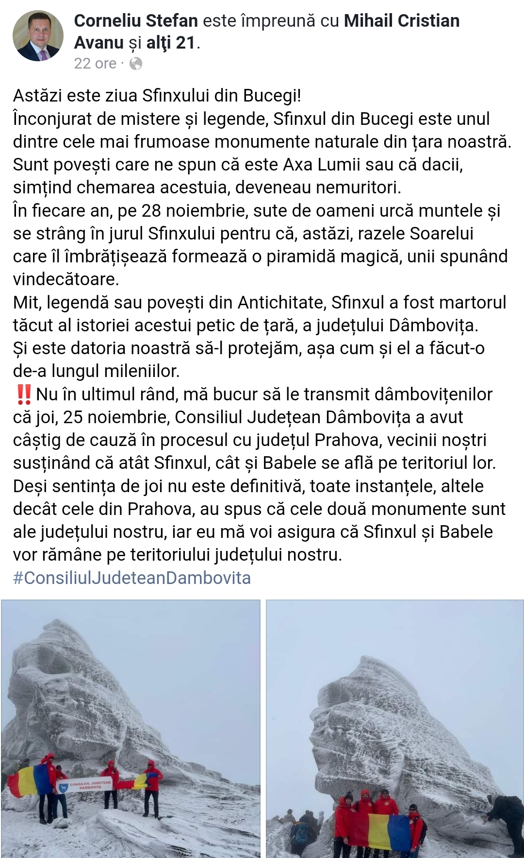 Front prahovaHotarare judecatoareasca definitiva! Sfinxul şi Babele din Bucegi se află în judeţul Dâmboviţa, nu în Prahova By RedactiePosted on 29/11/20212 min read0 0 1,048 Share on Facebook Share on Twitter Share on Google+ Share on Reddit Share on Pinterest Share on Linkedin Share on Tumblr Preşedintele Consiliului Judeţean Dâmboviţa, Corneliu Ştefan, a anunţat duminică, faptul că judeţul Dâmboviţa a obţinut în instanţă Sfinxul şi Babele din Bucegi, unele dintre cele mai cunoscute monumente naturale ale României, informează News.ro. Decizia nu este însă definitivă. „Mă bucur să le transmit dâmboviţenilor că joi, 25 noiembrie, Consiliul Judeţean Dâmboviţa a avut câştig de cauză în procesul cu judeţul Prahova, vecinii noştri susţinând că atât Sfinxul, cât şi Babele se află pe teritoriul lor”, a scris, duminică, pe Facebook, preşedintele Consiliului Judeţean Dâmboviţa. „Deşi sentinţa de joi nu este definitivă, toate instanţele, altele decât cele din Prahova, au spus că cele două monumente sunt ale judeţului nostru, iar eu mă voi asigura că Sfinxul şi Babele vor rămâne pe teritoriului judeţului nostru”, a adăugat Corneliu Ştefan. Procesul a fost deschis în 2015 şi se află pe rolul Tribunalului Vâlcea. Reclamant în dosar este prefectul judeţului Dâmboviţa, iar pârâţi sunt comuna dâmboviţeană Moroeni şi oraşul prahovean Buşteni. Prefectul judeţului Prahova are calitate de intervenient în dosar.