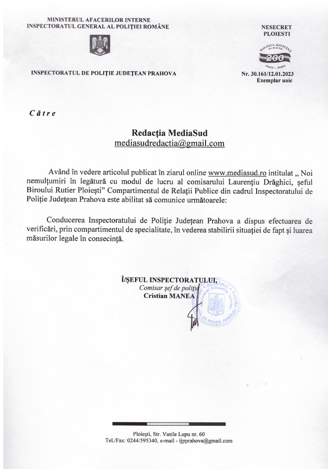 Front Ploiești PolitiaIPJ PRAHOVA a transmis un punct de vedere în urma articolului publicat de mediasud.ro By RedactiePosted on 12/01/202322 second read0 0 745 Share on Facebook Share on Twitter Share on Google+ Share on Reddit Share on Pinterest Share on Linkedin Share on Tumblr Am primit din partea IPJ PRAHOVA un punct de vedere în urma articolului ” Noi nemulțumiri în legătură cu modul de lucru al comisarului Laurențiu Drăghici, șeful Biroului Rutier Ploiești ”