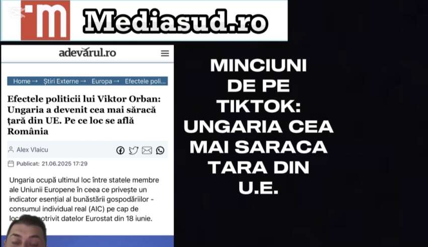Front Opinii UncategorizedMinciuni de pe TikTok: Ungaria suveranista cea mai săracă țară din U.E. By RedactiePosted on 23/06/20252 min read0 0 291 Share on Facebook Share on Twitter Share on Google+ Share on Reddit Share on Pinterest Share on Linkedin Share on Tumblr https://mediasud.ro/wp-content/uploads/2025/06/tiktok_marius_maris_7519043860752829719.mp4Am întrebat ChatGPT:Este Ungaria cea mai săracă țară din U.E.?Raspuns:Nu, Ungaria nu este cea mai săracă țară din Uniunea Europeană. Conform datelor actuale despre PIB-ul pe cap de locuitor, Ungaria se situează peste câteva țări din bloc:În 2025, PIB-ul nominal pe cap de locuitor în Ungaria este estimat la aproximativ 25 700 USD, plasând ţara pe locul 21 în UE, cu performanțe mai bune decât state precum România, Grecia sau Bulgaria .În termeni PPP (putere de cumpărare), Ungaria are 77 % din media UE, iar România chiar o depăşeşte uşor cu 78 % .Cea mai săracă ţară din UE, în funcţie de PIB/locuitor, este Bulgaria, la doar ~64 % din media UE .În sinteză, Ungaria este în zona de mijloc-scare a clasamentului european, fiind clar mai avansată din punct de vedere economic decât țările menționate mai jos—dar totuşi sub media UE. România se află acum uşor înaintea Ungariei, iar Bulgaria continuă să rămână cea mai modestă la acest capitol.