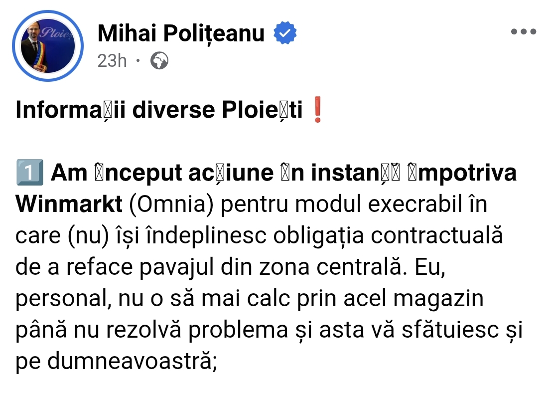 Front PloieștiPrimarul Polițeanu cere boicotarea magazinului Winmarkt: „Nu mai călcați în magazin până nu refac pavajul!” By RedactiePosted on 26/08/20255 min read0 0 120 Share on Facebook Share on Twitter Share on Google+ Share on Reddit Share on Pinterest Share on Linkedin Share on Tumblr Ploieștiul este scena unui conflict dur între autoritățile locale și unul dintre cele mai mari lanțuri de retail din oraș. Mihai Polițeanu anunță un proces și lansează un apel la boicot, transformând o dispută contractuală într-o luptă pentru spațiul public.Primarul orașului Ploiești, Mihai Polițeanu, a trasat o linie dură în conflictul dintre Municipalitatea Ploiești și compania Winmarkt (Omnia Group). După ce a anunțat că primăria a dat în judecată compania pentru nerespectarea obligațiilor de refacere a pavajului, Polițeanu a făcut un pas mai departe: a anunțat un boicot personal și a incitat public toți ploieștenii să facă la fel printr-o postare pe pagina sa de Facebook.„Până când cei de la Winmarkt nu își vor respecta angajamentul față de acest oraș și nu vor reface pavajul din zona centrală, eu nu voi mai călca pe pragul magazinului lor. Și vă recomand și vouă, ploieștenilor, să procedați la fel”, este mesajul pe care Polițeanu l-a postat pe contul personal.Un Conflict ce vine de multă vremeDisputa are la bază un acord care, probabil, a făcut obiectul autorizației de construire acordate pentru hypermarketul Winmarkt din zona centrală. Compania s-a angajat, în mod oficial, să efectueze unele lucrări de infrastructură și amenajare urbană, printre care și refacerea pavajului, pentru a compensa impactul pe care o astfel de construcție mare îl are asupra zonei.Conform autorităților, Winmarkt nu și-a îndeplinit aceste obligații în întregime sau în standardele așteptate, ceea ce a condus la demersul legal.De la Tribunal la popor! Strategia unui boicotÎn loc să se limiteze la a aștepta hotărârea instanței, Polițeanu a decis să escaladeze conflictul și să-l ducă în spațiul public. Anunțarea procesului a fost însoțită imediat de un apel direct la cetățeni.Această tactică îl plasează pe fostul primar pe un teren populist, asemănător unor figuri publice precum Călin Georgescu, care promovează lupta împotriva marilor corporații prin boicoturi și mobilizare civică. Polițeanu se poziționează astfel ca apărător al interesului colectiv și al esteticii orașului, punând presiune economică și de imagine directă pe companie.Întrebarea care rămâne este: cât de puternic va fi ecoul acestui apel în rândul locuitorilor Ploieștiului? Succesul unui boicot depinde întotdeauna de solidaritatea comunității și de măsura în care cetățenii se simt afectați direct de problema pavajului.Un lucru este cert! Refacerea pavajului din centrul Ploieștiului a devenit acum mai mult decât o simplă problemă de infrastructură, este un test al puterii pe care rămâne de văzut dacă o poate avea vocea unui lider local.