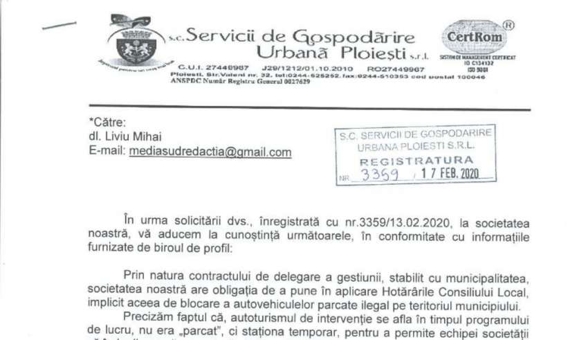 Diverse Eveniment Front Justiție Opinii Social UncategorizedPrintr-un comunicat emis redactiei mediasud.ro, SGU Ploiești consideră indreptațită incălcarea legii de catre angajați, pentru că dispozitivul de blocare a roților este greu By RedactiePosted on 21/02/20205 min read0 0 882 Share on Facebook Share on Twitter Share on Google+ Share on Reddit Share on Pinterest Share on Linkedin Share on Tumblr In urma articolelor publicate pe platforma on-line mediasud.ro, in care sesizam faptul ca angajatii SGU Ploiesti, care se ocupa cu blocarea autoturismelor parcate neregulamentar, aplica legea prin incalcarea aceleeasi legi, am primit pe adresa redactiei un comunicat din partea institutiei.Societatea considera ca ilegitatea staționărilor este normalăFoto de pe pagina oficiala SGU de FacebookIncalcarea legalitatii OUG 195/2002 este atat de fireasca pentru angajatii SGU, ca societatea posteaza chiar pe pagina oficiala astfel de imagini.Conducerea societatii considera ca incalcălcarea Ordonantei de Urgenta nr.195/2002, privind circulația pe drumurile publice de catre angajatii SGU este îndreptațită, pentru că sistemele de blocare au in jur de 4,5 kg ( n-am gasit in O.U.G. 195/2002 o astfel de excepție de la lege)!Rugam societatea sa aplice însemne aditionale semnelor de circulatie, unde se indica interzicerea opririi sau stationarii, cu specificatia daca staționați si aveti vre-un bagaj sau vre-o sacoșă in greutate de la 4,5 kg in sus, nu se aplica blocarea.Iata comunicatul” In urma solicitării dvs., inregistrata cu nr. 3359 din 13.02.2020, la societatea noastră, va aducem la cunostința următoarele, in conformitate cu informatiile furnizate de biroul de profil.Prin natura contractului de delegare a gestiunii, stabilit cu municipalitatea, societatea noastra are obligatia de a pune in aplicare Hotarârile Consiliului Local, implicit aceea de blocare a autovehiculelor, parcate ilegal pe teritoriul municipiului.Precizăm faptul ca autoturismul de intervenție se afla în timpul programului de lucru, nu era „parcat”, ci staționa temporar, pentru a permite echipei societații să îndeplinească prevederile HCL nr.2014/2015.Totodata, mentionam ca greutatea unui dispozitiv de blocare este in jur de 4,5 kg si pentru derularea rapida a procedurii de deblocare, precum si evitarea ingreunarii/blocarii traficului in zona respectiva, echipa de blocare pozitioneaza autovehiculul in functie de aceste considerente”Nota redactiei:Pentru evitarea „îngreunarii/blocarii traficului in zona” angajatii SGU ar trebui sa stationeze regulamentar. Si aici ne referim la toate actiunile pe care le fac pe parcursul zilei lucratorii de la ” blocari”. Cei care sunt in timpul serviciului si se deplaseaza pe raza municipiului Ploiesti, sa incerce sa aplice legea prin puterea exemplului. Iar daca cineva incalca legea sa fie sanctionat prin amenda contraventionala sau prin blocarea autoturismului, daca semnul de circulatie permite.Sanctiunile trebuie aplicate fara unitati de masura diferite, atat timp cat Ordonanta de Urgenta nr.195/2002, privind circulația pe drumurile publice nu face exceptie pentru angajatii SGU.Nimeni nu e mai presus de lege….dar aici se pare ca e ca la Ploiești…….Mai puteti citi pe mediasud.roConducerea S.G.U. PLOIEȘTI sustine tacit ilegalitațile angajațilorDetalii pe linkConducerea S.G.U. PLOIEȘTI sustine tacit ilegalitațile angajaților