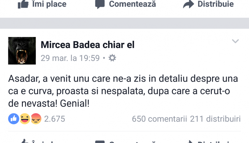 EvenimentMircea Badea a făcut-o curvă şi nespălată pe şefa DNAMircea Badea a postat pe pagina sa de facebook un text cu aluzie directă la recenta evaluare a procurorului general şi a şefei DNA: „Asadar, a venit unu care ne-a zis in detaliu despre una ca e curva, proasta si nespalata, dupa care a cerut-o de nevasta! Genial!” a consemnat Mircea Badea.Citeste mai mult