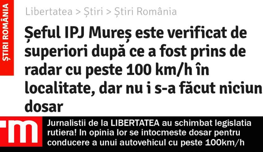 Front OpiniiJurnalistii de la Libertatea au schimbat legislatia rutiera! In opinia lor se intocmeste dosar pentru conducere a unui autovehicul cu peste 100 km/h in localitate„Șeful Inspectoratului de Poliție Județean Mureș, Dumitru Bîltag, este cercetat de Direcția Control Intern din cadrul Poliției Române, au declarat surse din Poliție. Verificările vin după ce, în urmă cu o săptămână, ziarul Libertatea a publicat O ÎNREGISTRARE ÎN CARE SEFUL IPJ MURES A FOST SURPRINS DE AGENTII DE LA RUTIERA în timp ce conduce cu peste 100km/h în localitate. …Citeste mai mult