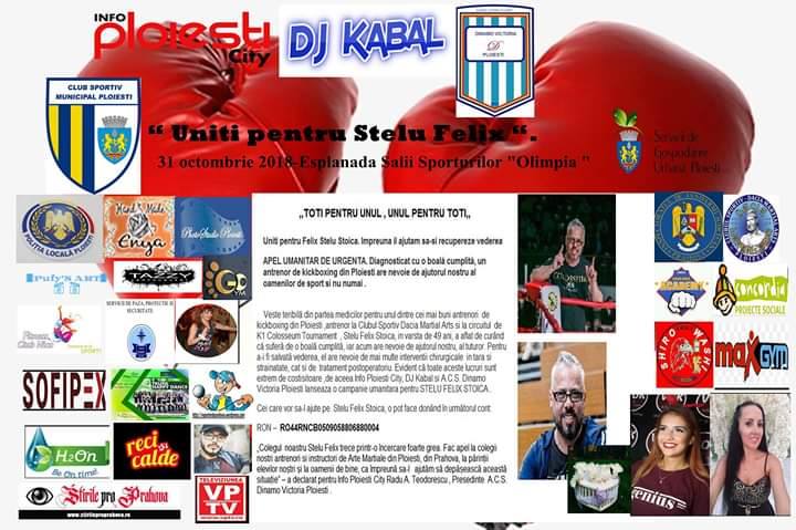 SocialUniți pentru Stelu Felix, eveniment sportiv caritabil la Sala Sporturilor „Olimpia“ By RedactiaPosted on 27/10/20188 min read0 0 623 Share on Facebook Share on Twitter Share on Google+ Share on Reddit Share on Pinterest Share on Linkedin Share on Tumblr Site-ul independent de stiri www.infoploiesticity.ro, DJ Kabal (Marian Cojocaru) si ACS Dinamo Victoria Ploiesti au demarat campania umanitară “Uniți pentru Stelu Felix“.Miercuri, 31 octombrie a.c., între orele 14.00-18.00, va avea loc pe esplanada Sălii Sporturilor “Olimpia“ (zona din dreapta sălii, spre parc) un eveniment caritabil pentru strângere de fonduri în scopul ajutorării unui antrenor de Kickboxing din municipiul Ploiești.Spectatorii se vor putea delecta cu demonstrații de tarabane cu Toboșarii de la Organizația Umanitară Concordia Ploiești, demonstratii de kickboxing și arte marțiale cu sportivii de la: Florin Ghiță Academy, Dacia Martial Art, Go Gym și Shiro Washi. Momente de dans cu majoretele Happy Dance și Paula Voicea. Zumba Kids cu Ancuța. Demonstrații de aerobic ale instructorilor de la Max Gym Ploiești și tombola Fitness Club Nico, care va acorda 10 abonamente personalizate. Momente de magie cu Victor Dorobanțu (Teatrul Ancuța). Multe momente surpriză și… porumbei albi.Prezintă Sandra Simion (solist vocal, dansatoare, arbitru stagiar CJA Prahova) si PettyMușa (actrița Teatrului „Toma Caragiu“ Ploiesti)Invitati :Mariana Cojocaru – astrologie, psihologie si numerology.Cătălin Simion – terapeut (Centrul Tendays)Cristian Nica și Lucian Radulescu (Președinte respectiv vicepreședinte CSM Ploiesti)Adrian Dobre – Primar mun. PloieștiDaniel Chiriță – fost fotbalist la Petrolul Ploiesti, fost internaţional, manager Școala de fotbal “Daniel Chirita“Tamara Costache – multipla campioană (europeană, mondială şi naţională) la înotMădălina Gojnea – fostă tenismenă (12 titluri ITF la simplu, 11 titluri ITF la dublu, 2 finale de Mare Şlem – juniori)Liviu Draghici – manager AntiCaffe New Experience-“Poetul din peluză“.Titi Tudor “Prosop“ – Maestru Emerit al sportului, antrenor de boxAlexandra Denişa Stoian (gimnastă la CSM Ploieşti) – a reprezentat jud. Prahova la Jocurile Olimpice de Tineret de la Buenos Aires, multiplă medaliată la campionate naţionale și internaţionale.Cristina Neagu (CSM Bucureşti) – multiplă campioana naţională la handbal, de două ori cea mai bună handbalistă a lumii – 2015, 2016)Cristi Vlad – Preşedinte FC Petrolul Ploiești, fost fotbalistMirela Dulgheru – cetăţean de onoare mun. Ploieşti, conferenţiar universitar doctor la Universitatea „Petrol – Gaze” Ploieşti, Fostă campioană mondială universitară de atletism, la proba de săritura în lungime (Buffalo – SUA, 1993).Echipa de fotbal FC Petrolul PloiestiMircea Dridea – Președinte de onoare FC Petrolul Ploiesti, fost mare fotbalist al lupilor galbeni, fost internaționalCătălina Dan – psihologVlad Mateescu – director Filarmonica “Paul Constantinescu “ PloieștiMihaela Rus – director Teatrul ”Toma Caragiu“ PloieștiBogdan Toader – Președinte Consiliul Județean PrahovaAndrei Ilinca – doctor UPU PrahovaParteneri: CSM Ploieşti, SGU Ploiesti ,ENYA’ HAND MADE , HAD Security, Dacia Martial Art, Fitness Club Nico .Sponsori: Reci si Calde, Sofipex, Spitalul Lotus Ploiesti.Parteneri foto: PhotoStudio Ploieşti, Tazzy Photography, Pufy ArtParteneri media: VP TV şi www.stirileproprahova.roVom avea la dispoziție și urne pentru donații financiare. „TOȚI PENTRU UNUL, UNUL PENTRU TOȚI!”Uniți pentru Felix Stelu Stoica. Împreună il putem ajuta să-și recupereze vederea.APEL UMANITAR DE URGENȚĂ. Diagnosticat cu o boală cumplită, un antrenor de kickboxing din Ploiești are nevoie de ajutorul nostru al oamenilor de sport și nu numai. Veste teribilă din partea medicilor pentru unul dintre cei mai buni antrenori de kickboxing din Ploiesti, antrenor la Clubul Sportiv Dacia Martial Arts si la circuitul de K1 Colosseum Tournament, Stelu Felix Stoica, în vârstă de 49 ani, a aflat de curând că suferă de o boală cumplită, iar acum are nevoie de ajutorul nostru, al tuturor. Pentru a-i fi salvată vederea, el are nevoie de mai multe interventii chirurgicale în țară și străinatate, cât și de tratament postoperatoriu. Evident că toate aceste lucruri sunt extrem de costisitoare, de aceea Info Ploiești City, DJ Kabal și A.C.S. Dinamo Victoria Ploiești lansează o campanie umanitară pentru STELU FELIX STOICA.Cei care vor sa-l ajute pe Stelu Felix Stoica, o pot face donând în următorul cont:RON – RO44RNCB0509058806880004 „Colegul noastru Stelu Felix trece printr-o încercare foarte grea. Fac apel la colegii nostri antrenori si instructori de Arte Martiale din Ploiesti, din Prahova, la părinţii elevilor noştri şi la oamenii de bine ca, împreună, să-l ajutăm să depăşească această situaţie. Stelu Felix Stoica este diagnosticat cu „Basedow Graves“ ( slăbirea vederii, diplopie si exoftalmie), avand nevoie de mai multe intervenții chirurgicale, o operatie costând circa 15.000 de euro. Acesta, de peste 1 an, urmează un tratament medicamentos, însă tratamentul nu dă roade.“ – a declarat, pentru Info Ploiesti City, Radu A. Teodorescu, Președinte A.C.S. Dinamo Victoria Ploiești.